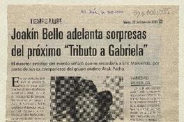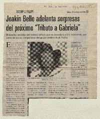Joakín Bello adelanta sorpresas del próximo "tributo a Gabriela" [artículo] / El Día (Diario : La Serena, Chile)-- oct. 25, 2005, p. 25. .