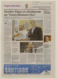 Hombre pájaro es oficialmente un "tesoro humano vivo" [artículo] / Nelson Zapata. El Austral (Diario : Osorno, Chile)-- oct. 11, 2012, p. 25. .