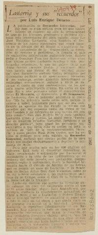 Lastarria y sus "recuerdos" [artículo] / Luis Enrique Délano. Las Noticias de Ultima Hora (Diario : Santiago, Chile)-- mayo 26, 1968, p. 5. .