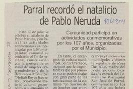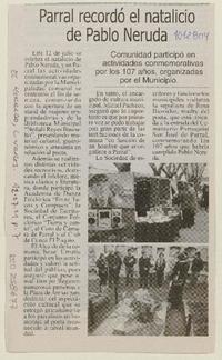 Parral recordó el natalicio de Pablo Neruda [artículo] El Heraldo (Diario : Linares, Chile)-- jul. 12, 2011, p. 7 .
