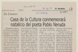 Casa de la Cultura conmemorará natalicio del poeta Pablo Neruda [artículo] El Heraldo (Diario : Linares, Chile)-- jul. 9, 2011, p. 3 .