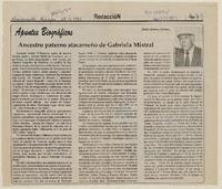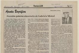 Ancestro paterno atacameño de Gabriela Mistral [artículo] / Oriel Alvarez Gómez. Chañarcillo. -- mar. 28, 1995, p. 3. retr. .