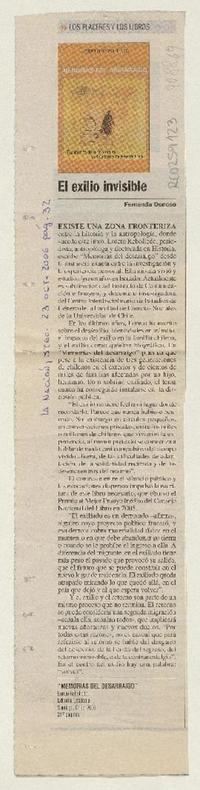 El exilio invisible [artículo]/ Fernanda Donoso. La Nación (Diario: Santiago, Chile) oct. 23, 2006, p. 32 .