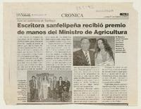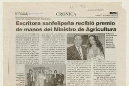 Escritora sanfelipeña recibió premio de manos del ministro de agricultura [artículo] El Valle (Aconcagua, Chile)-- oct. 27, 2005, p. 6 .