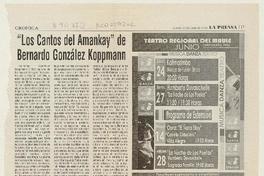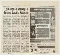 "Los Cantos del Amankay" de Bernardo González Koppmann [artículo] / Rodolfo de los Reyes Recabarren. La Prensa (Diario : Maule, Chile) jun. 22, 2006, p. 17. .