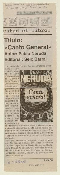 "Canto General" [artículo] / Luis Paz. El Alba (Semanario: Valparaíso, Chile)-- jul. 21, 2001, p. 16. il. .