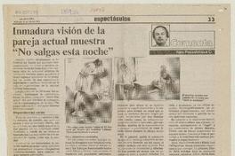 Inmadura visión de la pareja actual muestra "No salgas esta noche" [artículo] / Italo Passalacqua C. La Segunda (Diario : Santiago, Chile)-- jul. 31, 1991, p. 33 retr. .