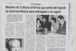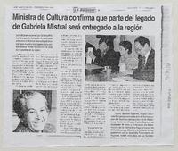 Ministra de Cultura confirma que parte del legado de Gabriela Mistral será entregado a la región [artículo]. La Región (Coquimbo, Chile) sept. 15, 2007 .