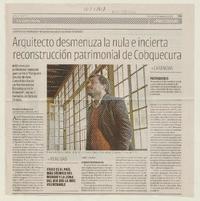 Arquitecto desmenuza la nula e incierta reconstrucción patrimonial de Cobquecura [artículo] / Patricia Orellana Cea. La Discusión (Diario : Chillán, Chile)-- mar. 16, 2012, p. 23. .