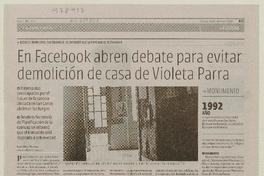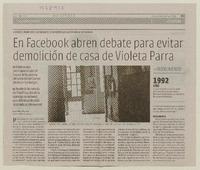 En Facebook abren debate para evitar demolición de casa de Violeta Parra [artículo] / Carolina Marcos. La Discusión (Diario : Chillán, Chile)-- abr. 29, 2010, p. 21. .
