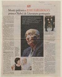 Murió polémico José Saramago, Premio Nobel de Literatura portugués [artículo]. La Segunda (Diario : Santiago, Chile)-- jun. 18, 2010, p. 77. .