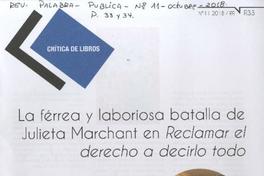 La férrea y laboriosa batalla de Julieta Marchant en reclamar el derecho a decirlo todo [artículo] / por Patricia Espinosa. Palabra Pública (Revista : Santiago, Chile)-- Octubre 2018, número 11, p. 33-34. 2 páginas : ilustraciones en color. .