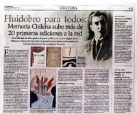 Huidobro para todos memoria chilena sube más de 20 primeras ediciones a la red / [artículo] : Iñigo Díaz. El Mercurio (Diario : Santiago, Chile)-- oct. 13, 2018, p. A11. 1 página : ilustraciones en color. .