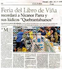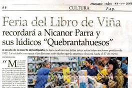Feria del libro de Viña recordará a Nicanor Parra y sus lúdicos "quebrantahuesos" / [artículo] : Cristofer Díaz Ríos. El Mercurio (Diario : Santiago, Chile)-- ene. 22, 2019, p. A8. 1 página : ilustración en color. .