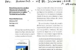 Benedictus montes amabat historia de la fundación del monasterio de la Sma. Trinidad de Las Condes [artículo] : María Paz Vega. Humanitas (Revista : Santiago, Chile)-- no. 89 (Primavera 2018), p. 673-674. 2 páginas : ilustración en color. .