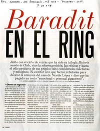 Baradit en el ring [entrevista] / [artículo] : por Antonio Domeyko ; retrato Felipe Vargas ; dirección de arte Manuel Godoy. El Mercurio (Diario : Santiago, Chile)-- feb. 2, 2019, p. 24-28 (suplemento no. 1063 "Sábado") 5 páginas : ilustreación en color. .