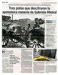 Tres pistas que descifraron la apoteósica romería de Gabriela Mistral [artículo] / Daniel Aguayo. Las Últimas Noticias (Diario : Santiago, Chile)-- feb. 19, 2019, p. 2. 1 página : ilustración en blanco y negro. .