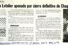 Hernán Rivera Letelier apenado por cierre definitivo [artículo]. El Mercurio (Diario: Antofagasta, Chile) Marzo 11, 2007, página A49. 1 página. .
