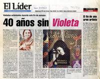 40 años sin Violeta [artículo] / El Líder (San Antonio, Chile)-- Febrero 3, 2007, página 24. 1 página : ilustraciones en color. .