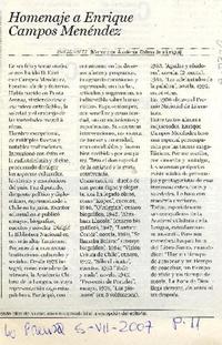 Homenaje a Enrique Campos Menéndez [artículo] / Matías Rafide. La Prensa (Maule, Chile) p. 11 Julio 5, 2007, página 11. 1 página. .