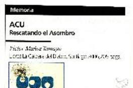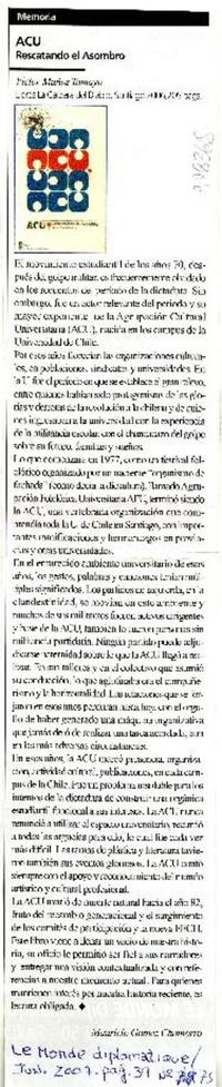 ACU Rescatando el asombro [artículo] / Mauricio Gómez Chamorro. Le Monde Diplomatique (Diario: Santiago, Chile) Número 75 (junio 2007) página 39. 1 página : ilustración en color. .