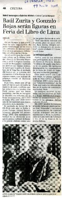 Raúl Zurita y Gonzalo Rojas serán figuras en Feria del Libro de Lima [artículo] / Sonia Lira. La Tercera (Diario: Santiago, Chile) Julio 11, 2007, página 40. 1 página. .
