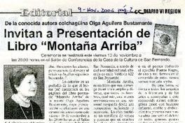 Invitan a presentación de libro "Montaña Arriba". [artículo] Diario VI Region (Diario : San Fernando, Chile)-- nov. 9, 2006, p. 2. .