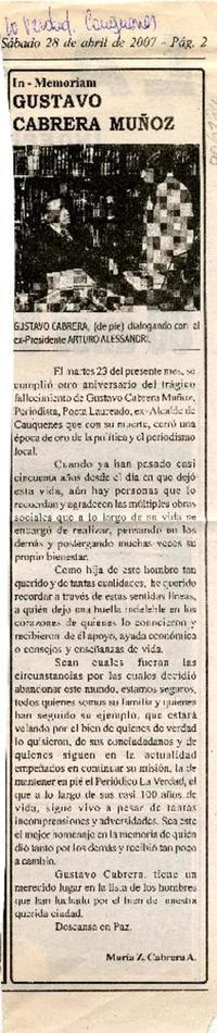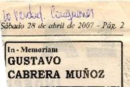 In - Memoriam Gustavo Cabrera Muñoz [artículo] / María Z., Cabrera A. La Verdad (Diario : Cauquenes, Chile)-- Abril 28, 2007, página 2. 1 página : ilustración en blanco y negro. .