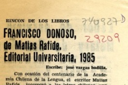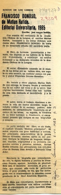 Francisco Donoso, de Matías Rafide. Editorial Universitaria, 1985 [artículo] / Escribe: José Vargas Badilla. La Región (Diario : San Fernando, Chile)-- Julio 6, 1985, página 3 1 página : .