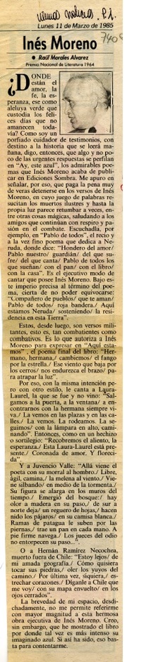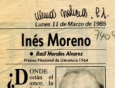 Inés Moreno [artículo] / Raúl Morales Alvarez. Las Últimas Noticias (Diario : Santiago, Chile)-- Marzo 11, 1985, página 2 1 página : ilustración en blanco y negro ; .