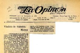 Vitalicio de Gabriela Mistral [artículo] La Opinión del Norte (Diario : Illapel, Chile)-- abr. 9, 1986, p. 1. 1 página. .