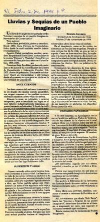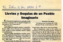 Lluvias y sequías de un pueblo imaginario [artículo] / Rolando Carrasco. El Siglo (Diario : Santiago, Chile)-- dic. 2, 1994, p. 9. 1 página. .