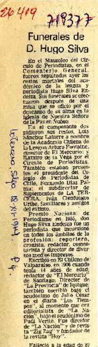 Funerales de D. Hugo Silva. [artículo] La Tercera (Diario : Santiago, Chile)-- nov. 18, 1979, p. 4. 1 página. .