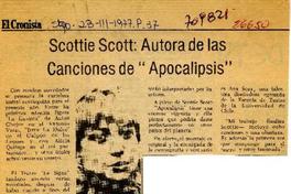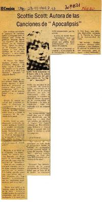 Scottie Scott: autora de las canciones de "Apocalipsis". [artículo] El Cronista (Diario : Santiago, Chile)-- mar. 23, 1977, p. 37. 1 página : ilustración en blanco y negro. .