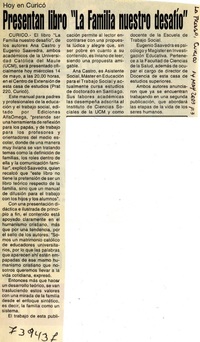 Presentan libro "La familia nuestro desafío". [artículo] La Prensa (Diario : Curicó, Chile)-- mayo 14, 2003, página 3 1 página : .