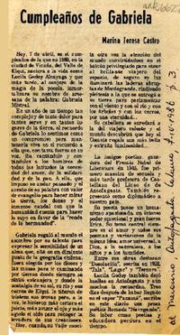 Cumpleaños de Gabriela [artículo] / Marina Teresa Castro. El Mercurio (Diario : Antofagasta, Chile)-- abr. 7, 1986, p. 3. El Mercurio (Diario : Calama, Chile)-- abr. 7, 1986, p. 3. La Estrella (Diario : Iquique, Chile)-- abr. 16, 1986, p. 2. 1 página. .