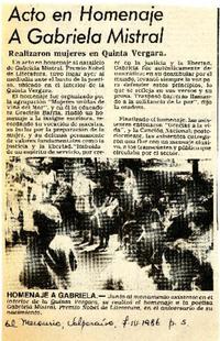 Acto en homenaje a Gabriela Mistral [artículo] / El Mercurio (Diario : Valparaíso, Chile)-- abr. 7, 1986, p. 5. 1 página : ilustración en blanco y negro. .