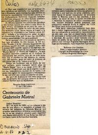 Centenario de Gabriela Mistral [artículo] / Roberto Gac Canales. El Mercurio (Diario : Santiago, Chile)-- mayo 16, 1986, p. A2 1 página. .