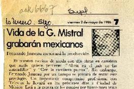 Vida de la G. Mistral grabarán mexicanos [artículo] La Tercera (Diario : Santiago, Chile)-- mayo 2, 1986, p. 7 (suplemento) 1 página : ilustración en blanco y negro. .