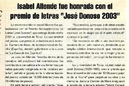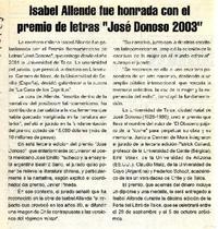 Isabel Allende fue honrada con el premio de letras "José Donoso 2003" [artículo] Atacama (Diario : Copiapó, Chile)-- Septiembre 6, 2003, página 22. .