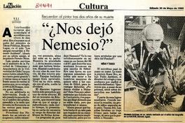 Recuerdan al pintor tras dos años de su muerte "Nos dejo Nemesio"? / [artículo] : V.S.J La Nación (Diario : Santiago, Chile)-- mayo 20, 1995, p. 19. 1 página : ilustración en blanco y negro. .