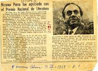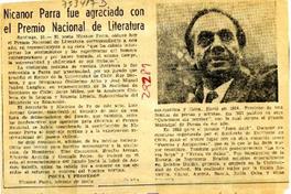 Nicanor Parra fue agraciado con el Premio Nacional de Literatura [artículo]. El Mercurio (Diario : Calama, Chile) Septiembre 17, 1969, página 1. 1 página : ilustración en blanco y negro. .