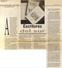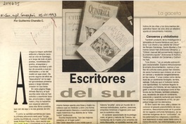 Escritores del sur [artículo] / Guillermo Chandía C. El Sur (Diario : Concepción, Chile)-- jul. 25, 1993, p. 9 (suplemento) 1 página : ilustración en blanco y negro. .