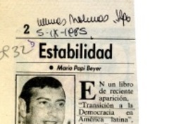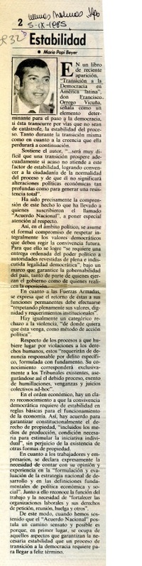 Estabilidad [artículo] / Mario Papi Beyer. Las Últimas Noticias (Diario : Santiago, Chile)-- sept. 5, 1985, p. 2. 1 página : ilustración en blanco y negro. .
