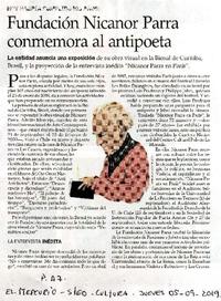 Fundación Nicanor Parra conmemora al antipoeta. [artículo] El Mercurio (Diario : Santiago, Chile)-- sept. 5, 2019, p. A7. 1 página : ilustración en color. .