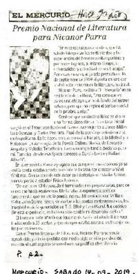 Premio Nacional de Literatura para Nicanor Parra. [artículo] El Mercurio (Diario : Santiago, Chile)-- sept. 14, 2019, p. A2 (suplemento "Sábado") 1 página : ilustración en blanco y negro. .