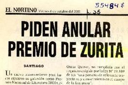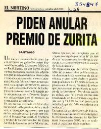 Piden anular premio de Zurita [artículo] El Nortino (Diario : Iquique, Chile)-- oct. 6, 2000, p. 35. 1 página. .