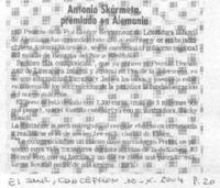 Antonio Skármeta premiado en Alemania [artículo] El Sur (Diario : Concepción, Chile)-- oct. 30, 2004, p. 20 .