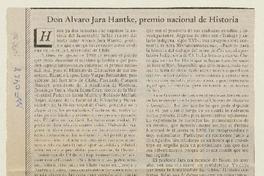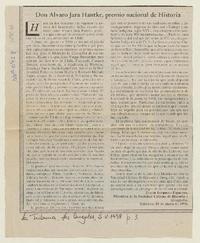 Don Alvaro Jara Hantke, Premio Nacional de Historia [artículo] / Zenón Jorquera Figueroa. La Tribuna (Los Angeles). -- mayo 5, 1998, p. 3. .