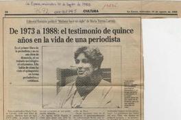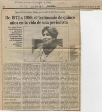 De 1973 a 1988, el testimonio de quince años en la vida de una periodista [artículo]. La Epoca. -- ago. 10, 1988, p. 26 .